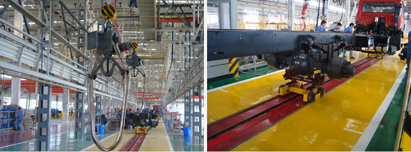 該項目由總裝配線和車身分裝線組成。總裝配線用于整車底盤裝配及檢查下線,它由兩部分組成,前部分采用單鏈牽引小車形式,即可調臺車間距垂直返回式地拖鏈,后部分采用雙板鏈形式。總裝線產品上線為起吊設備吊裝上線,產品下線為駕駛員駕駛產品下線。產品在總裝配線上由兩臺至四臺臺車支撐運行,完成駕駛室、輪胎、車廂等的裝配作業。為了使產品在雙行道板鏈和地拖鏈之間自動平滑過渡,在地拖鏈的末端與雙行道板鏈重疊段設置向下的緩坡。