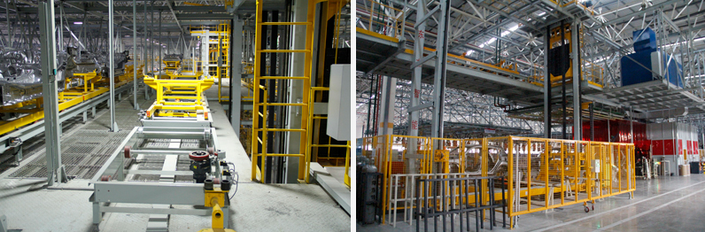 江鈴控股焊裝輸送線包括:包括焊裝至涂裝工廠滾床輸送設備(WBS)、 下車體線轉主線暫存輸送、主線轉調整線輸送、車身調整線等。主要機械設備有升降機、堆垛拆垛、叉式移載、輸送設備二樓鋼平臺及吊掛鋼平臺等。輸送線配置有CS控制系統,AVI信息系統,實時監控系統、車身調度、故障報警等功能。完成白車身的輸送、轉接、儲存和排序等功能。