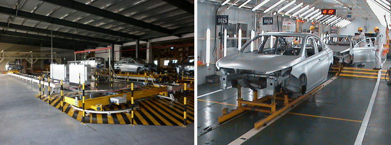 神龍一工廠焊裝輸送線生產線包括:空中滑橇輸送線、主車身生產線升降機、地面調整線輸送線、以及焊油懸鏈,共10條輸送線。它適用于TX9/T9多品種車型總成混流生產。全車間機械設備和電控設備,嚴格按照神龍DPCA法國標準執行。輸送線配置有CS控制系統,實現實時監控現場設備、車身儲存區出入車輛調度、設備故障報警提示等功能,實現了車輛的信息化管理。